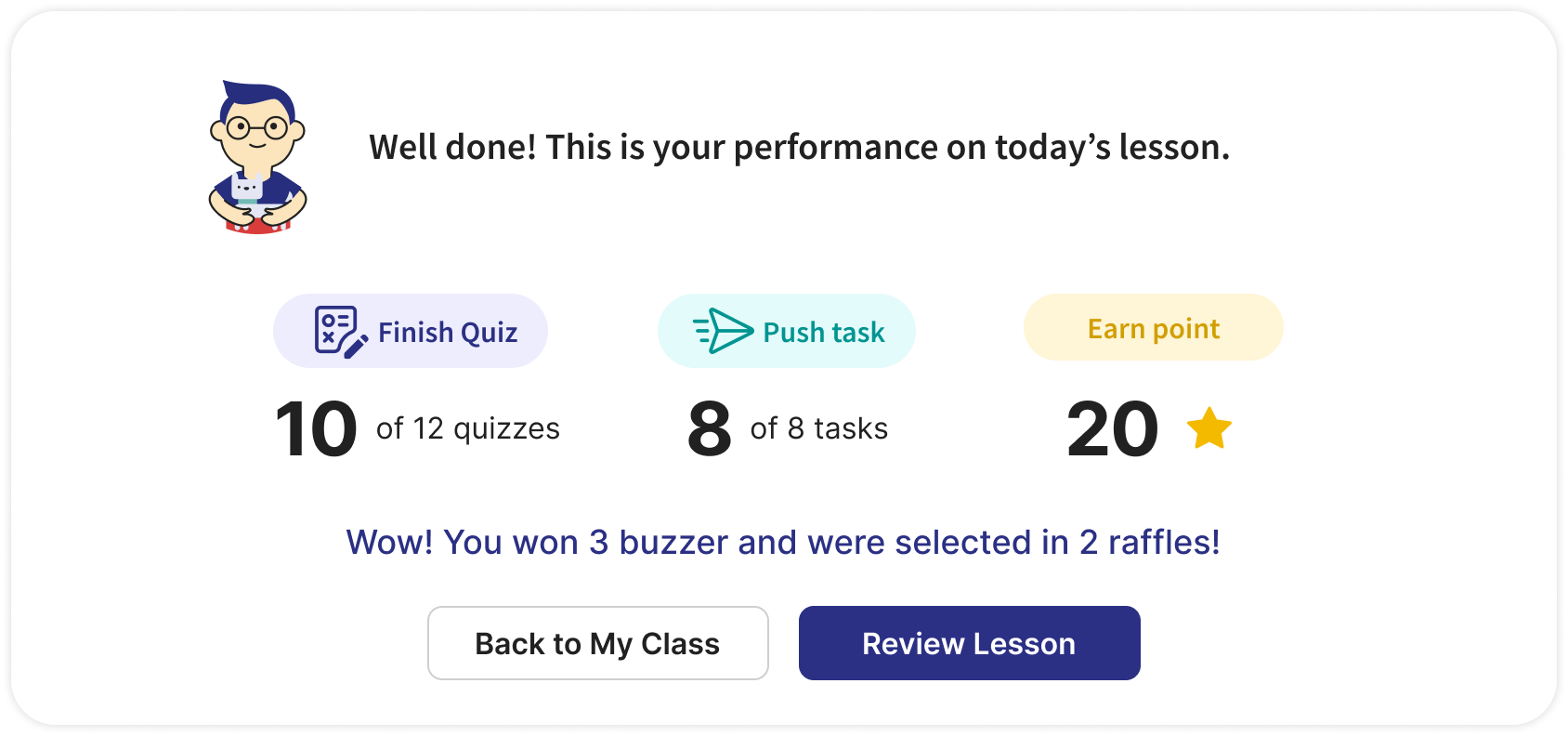 With the Class ID provided by their educators, students can join live classes and access a detailed record of their past class performance. This includes insights into quiz results, push-and-respond activities, how often they were selected by the teacher, their buzzer interactions, and overall class participation.